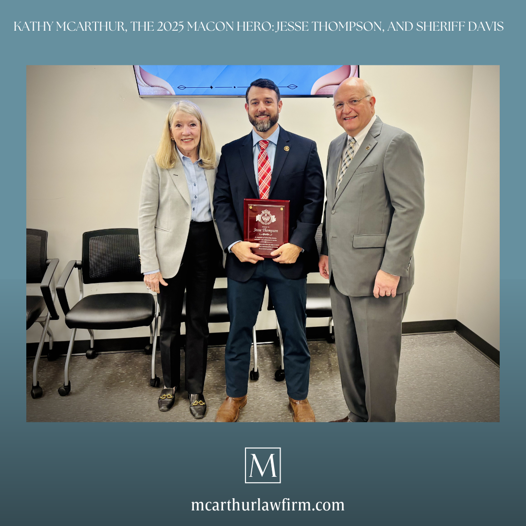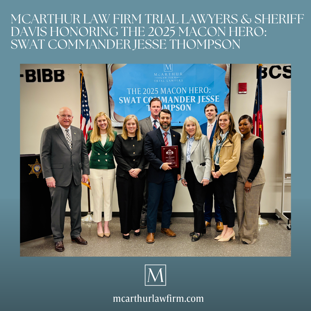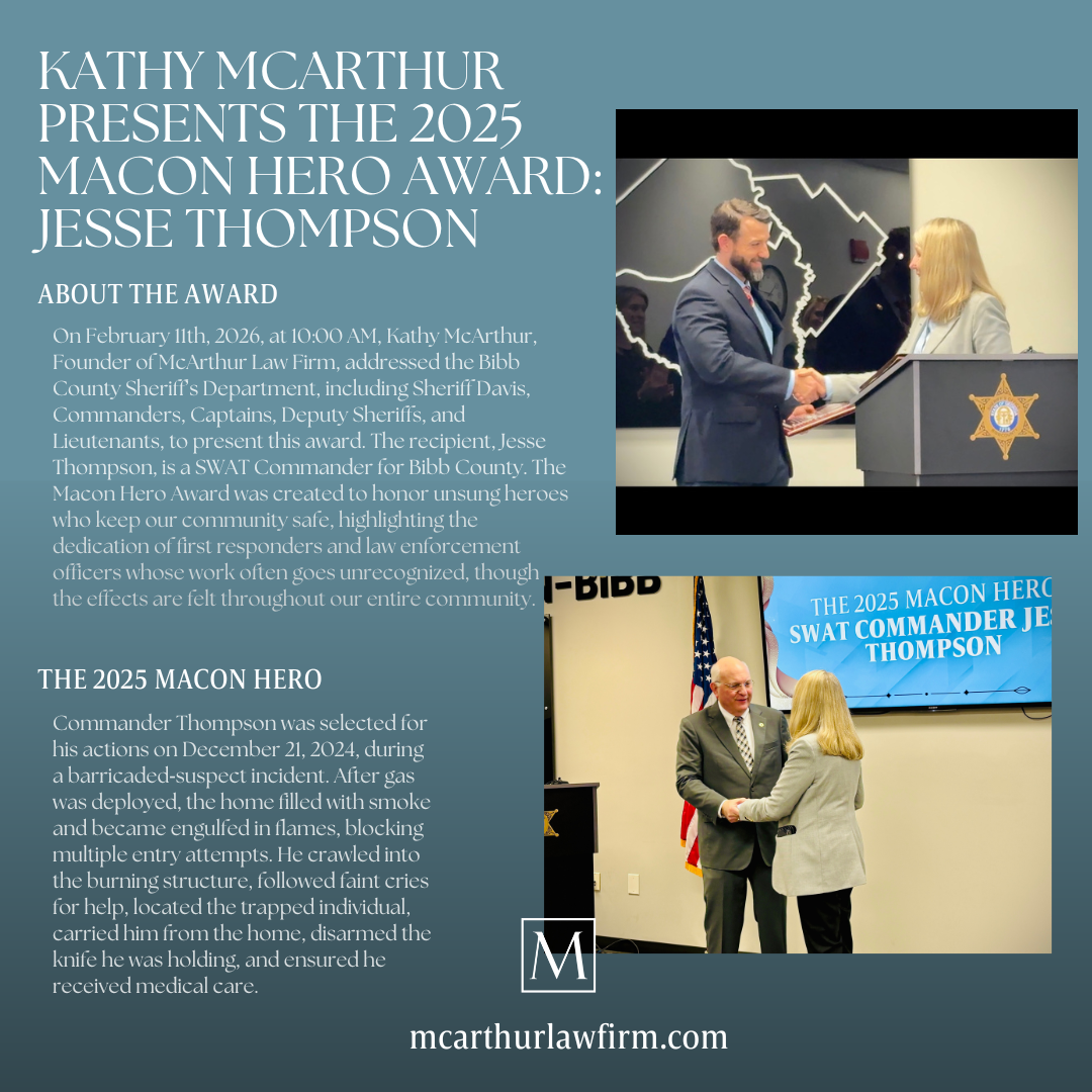 On February 11th, 2026, at 10:00 AM, Kathy McArthur, Founder of McArthur Law Firm, addressed the Bibb County Sheriff’s Department, including Sheriff Davis, Commanders, Captains, Deputy Sheriffs, and Lieutenants, to present this award. The recipient, Jesse Thompson, is a SWAT Commander for Bibb County. The Macon Hero Award was created to honor unsung heroes who keep our community safe, highlighting the dedication of first responders and law enforcement officers whose work often goes unrecognized, though the effects are felt throughout our entire community.