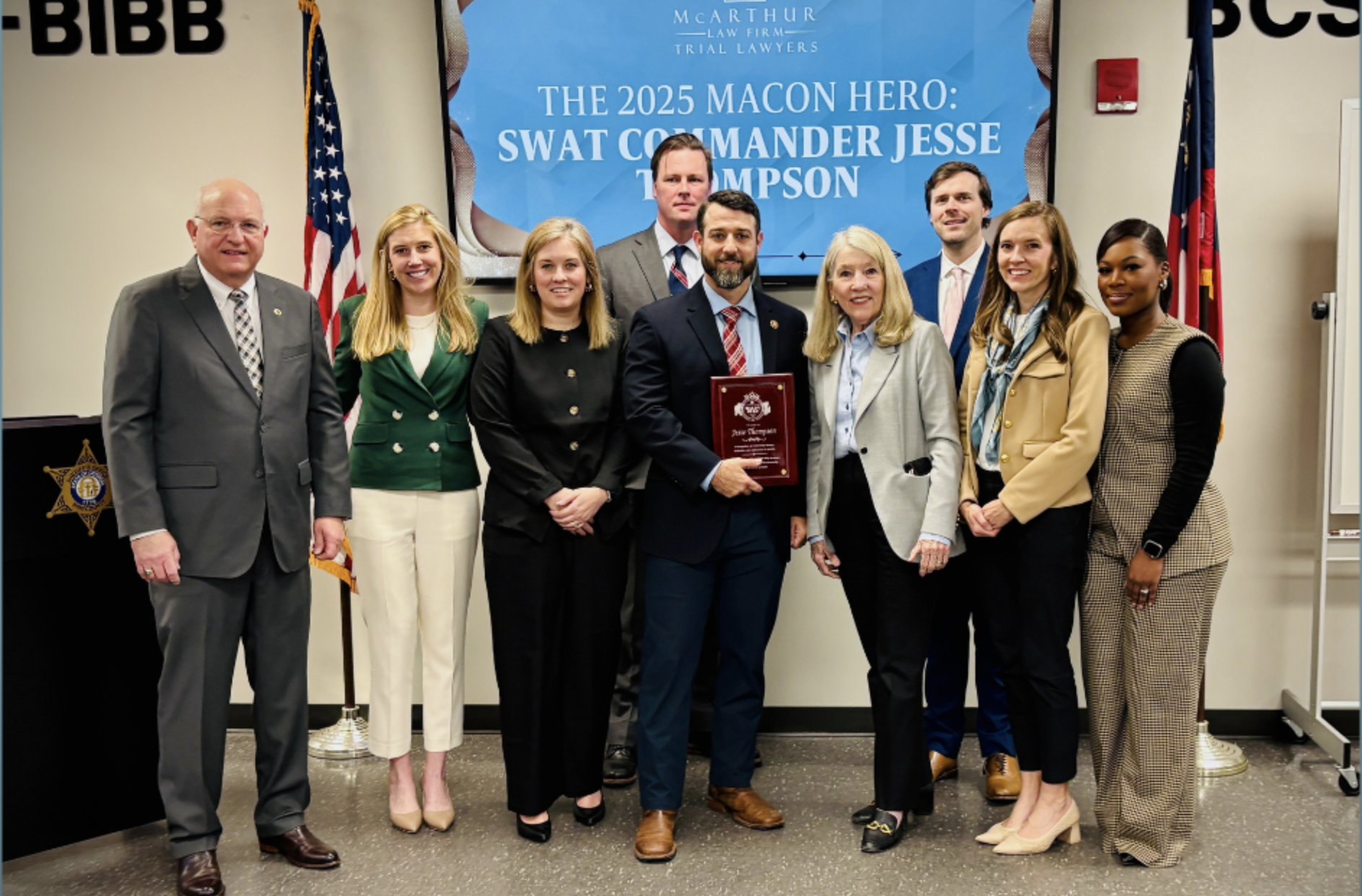 On February 11th, 2026, at 10:00 AM, Kathy McArthur, Founder of McArthur Law Firm, addressed the Bibb County Sheriff’s Department, including Sheriff Davis, Commanders, Captains, Deputy Sheriffs, and Lieutenants, to present this award. The recipient, Jesse Thompson, is a SWAT Commander for Bibb County. The Macon Hero Award was created to honor unsung heroes who keep our community safe, highlighting the dedication of first responders and law enforcement officers whose work often goes unrecognized, though the effects are felt throughout our entire community.