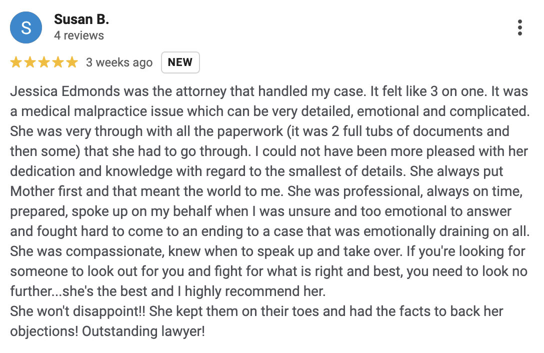“Last year I was in an auto accident and initially felt overwhelmed. Once I called attorney Jessica Edmonds, I was immediately at ease. She was with me through the entire process and always took the extra time to explain situations in a way I could comprehend. She was kind and professional, but most importantly- she got results. I cannot say enough good things about Jessica and her team! They took the stress out of a stressful situation and I will always be grateful for their work.”