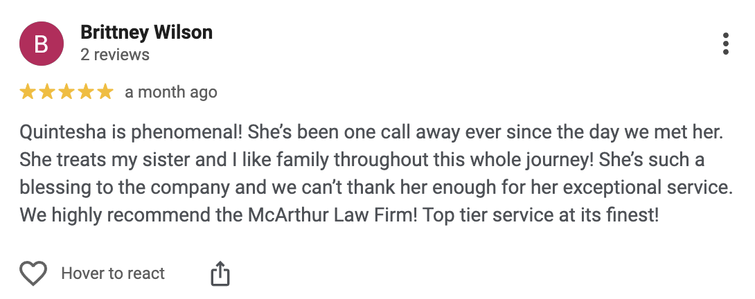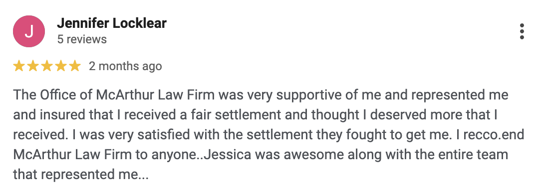 “I would not hesitate. I wouldn’t look for any other lawyers, I would RUN to McArthur Law Firm.”